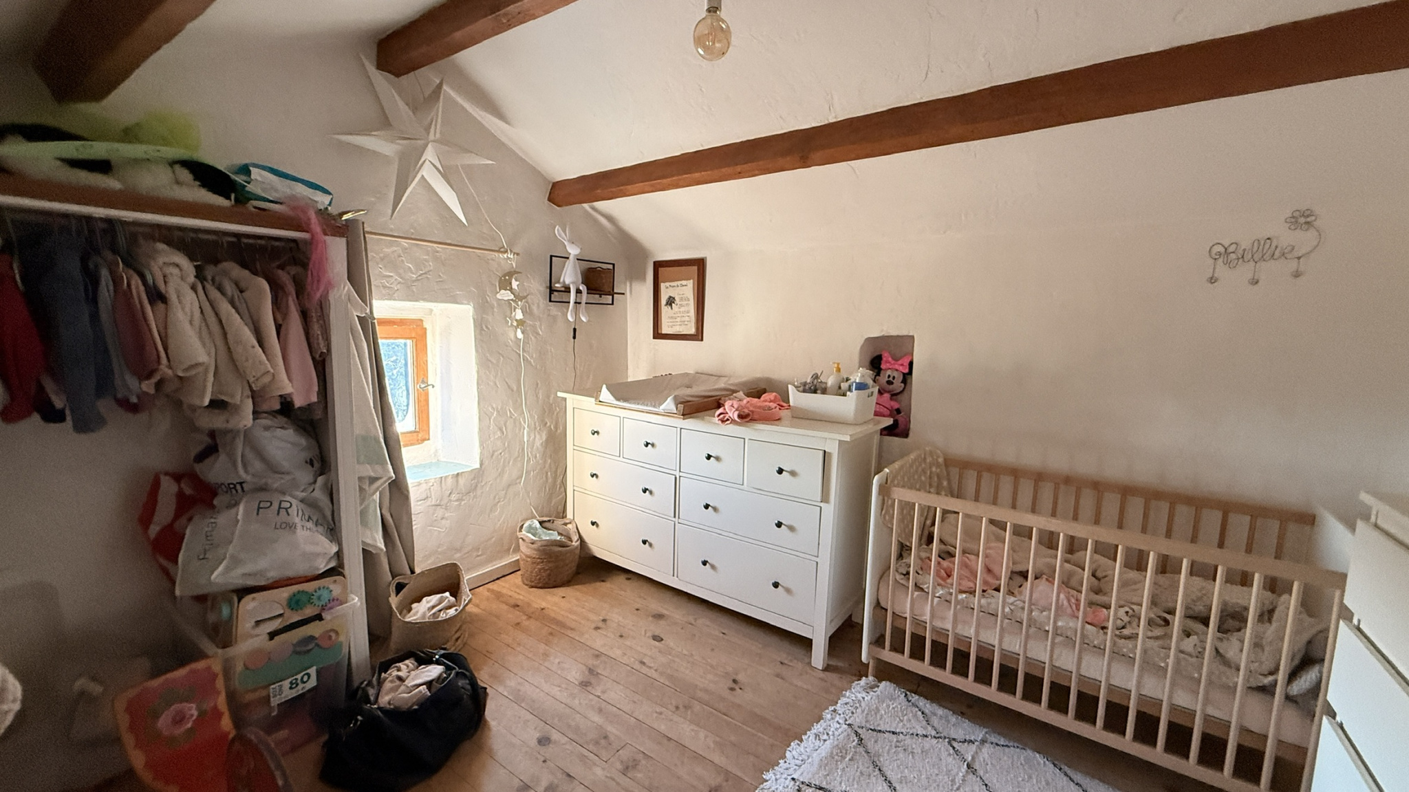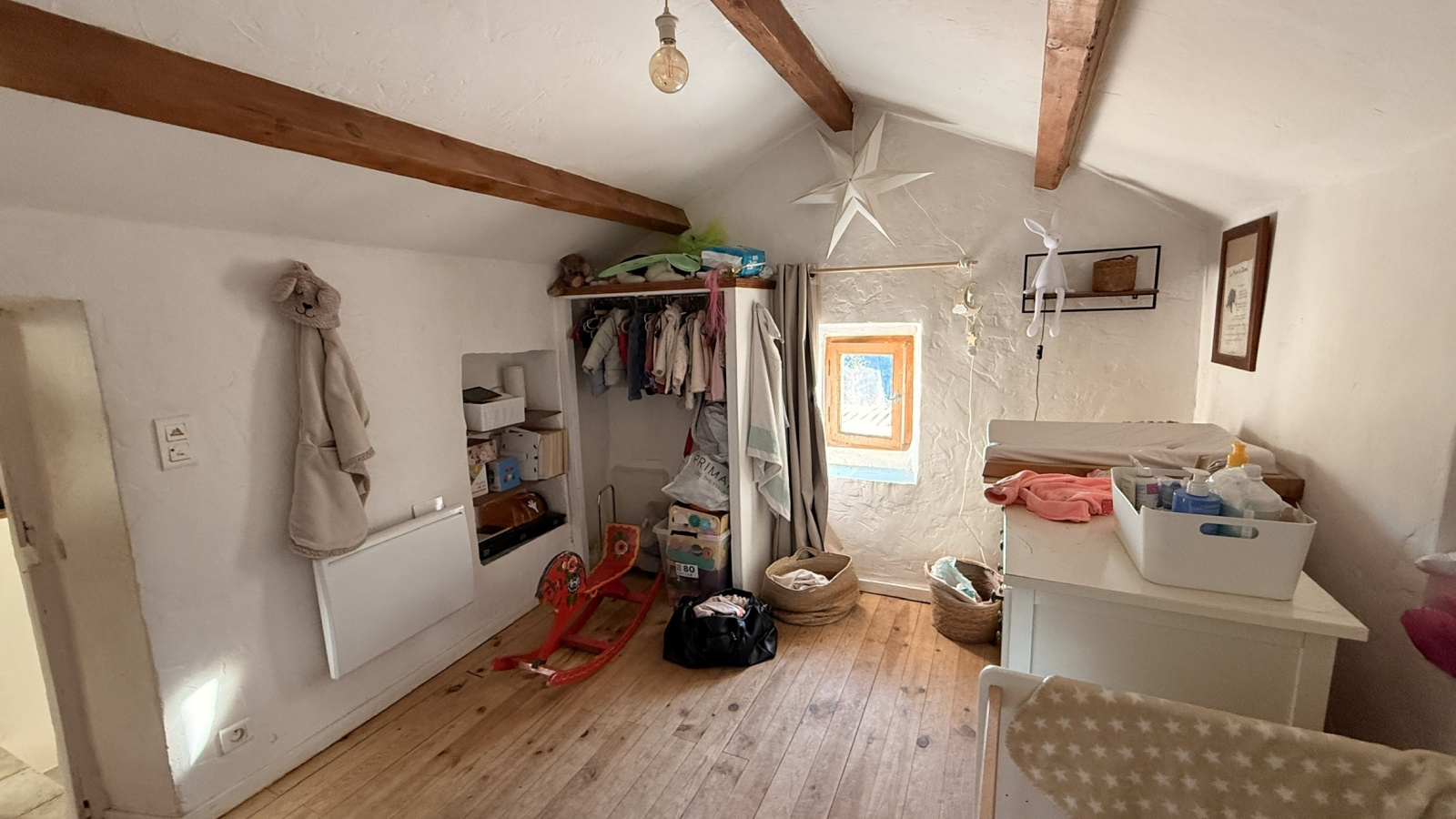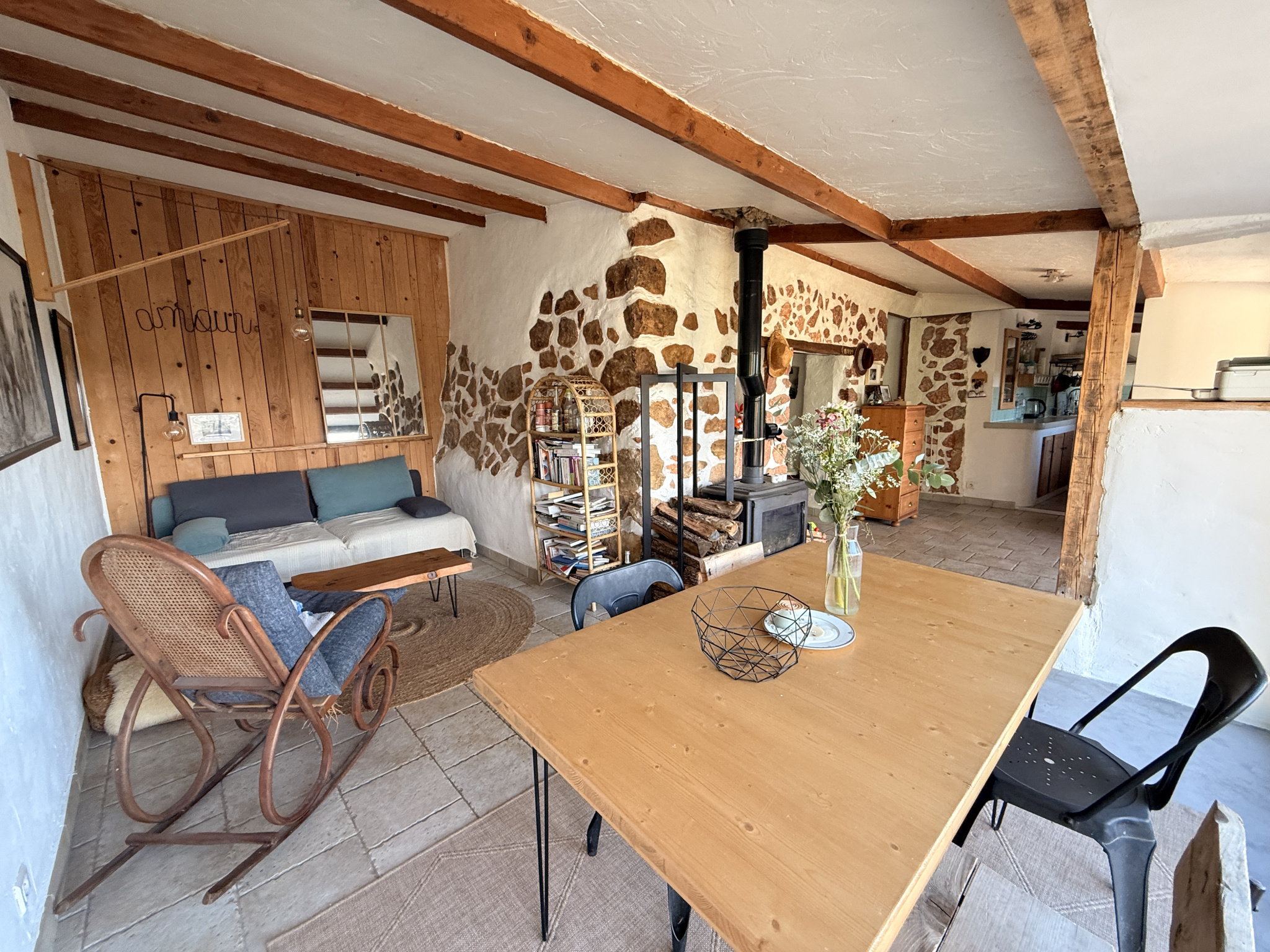 Maison rénovée, toiture entièrement refaite en 2024 composée d'un séjour, un salon avec poêle à bois, une cuisine aménagée, une chambre avec placard et dressing, une deuxième chambre, une salle de bain avec wc.