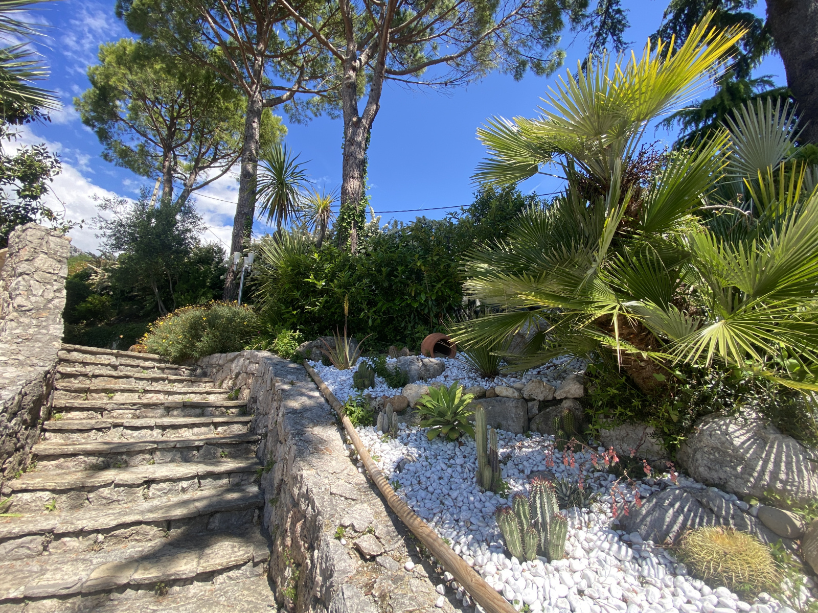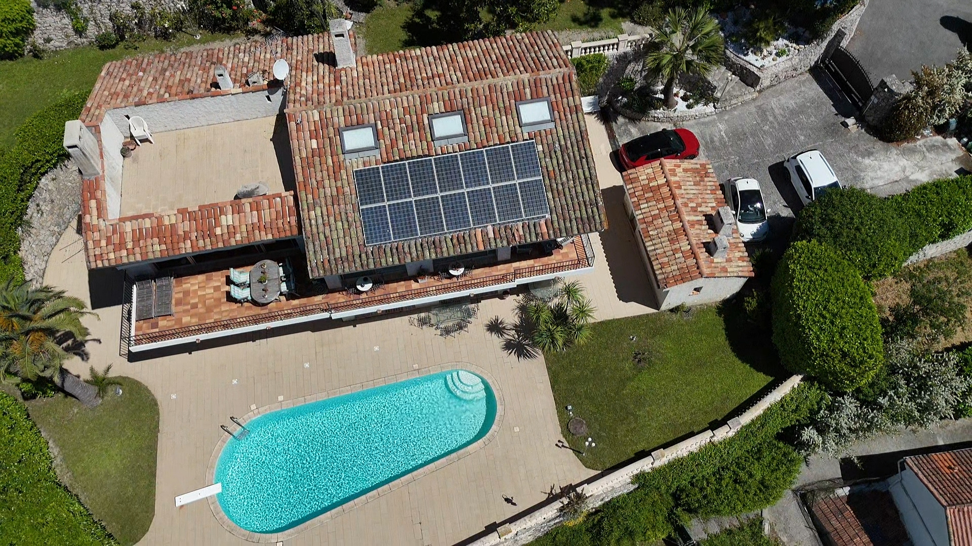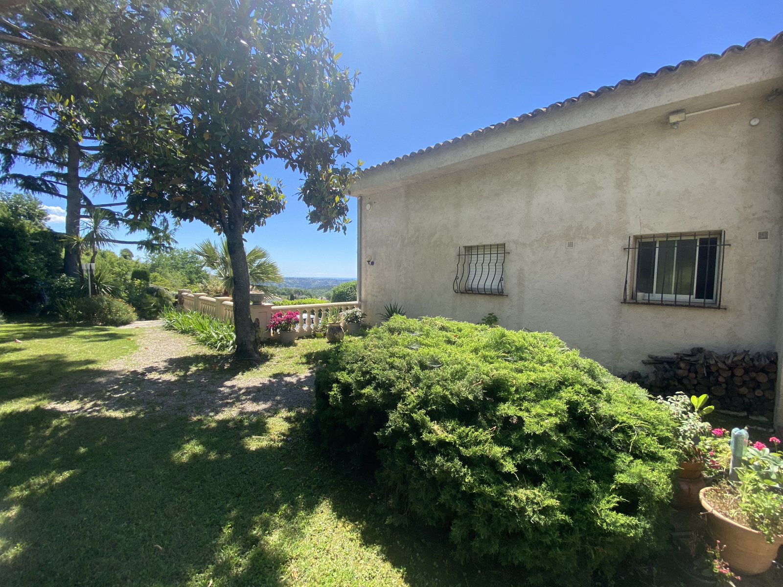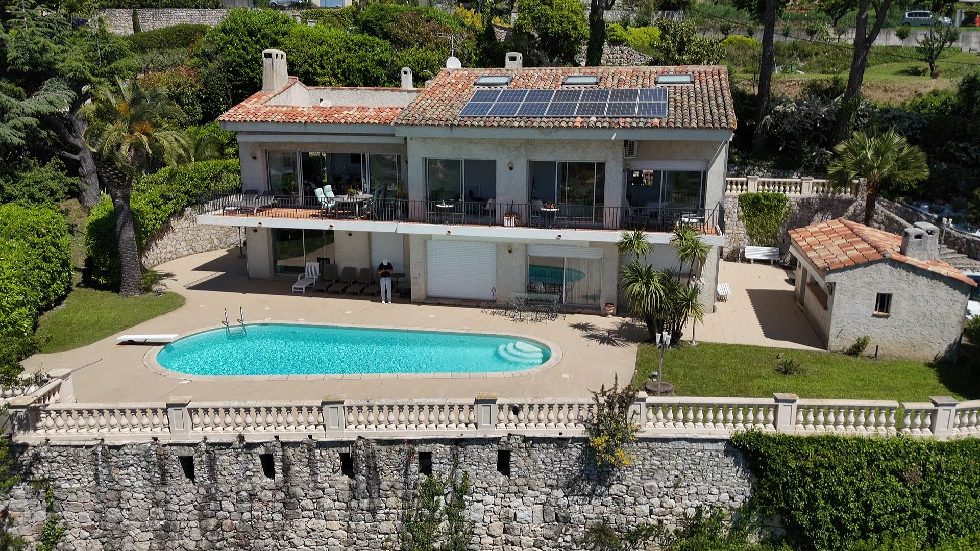En position dominante, villa construite sur un terrain complanté d'essences meridionales, piscine et pool house. De plain pied, grand salon avec large baie vitrée ouvrant sur une spacieuse terrasse, cuisine séparée et équipée. Coin nuit avec une chambre de maître avec salle de bain, 2 chambres, une salle d'eau et wc séparés. A l'étage, bel espace aménagé avec salle de jeux, sauna, w-c, bureau donnant sur un solarium; Au niveau de la piscine, grand espace aménageable, salle de sport, cave, atelier et garage. Exposition Sud. Vue dégagée.